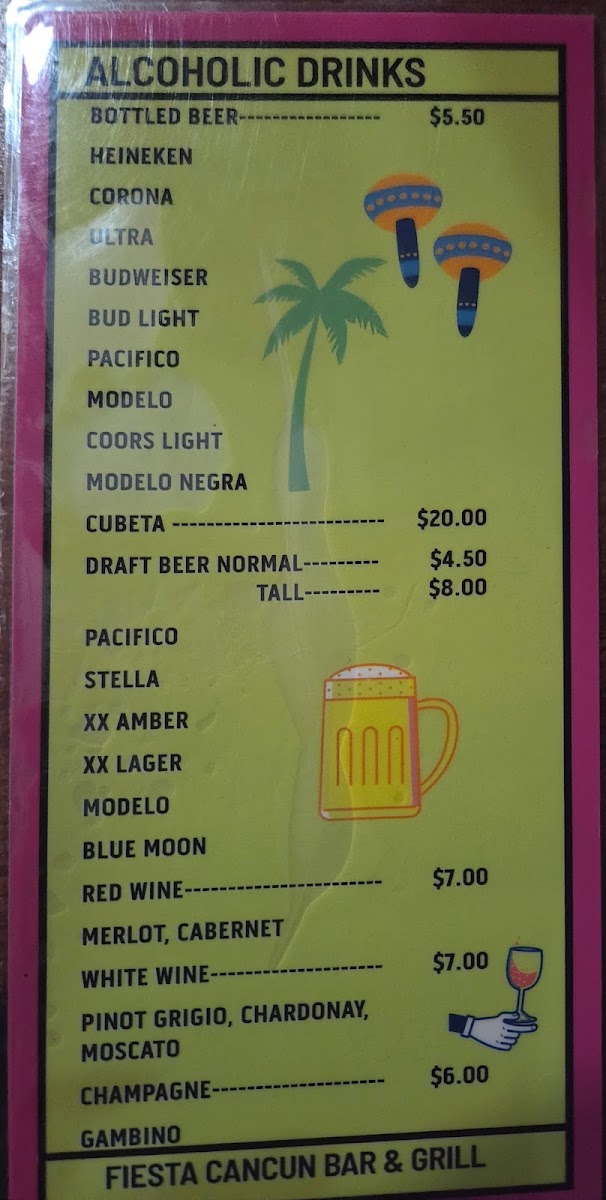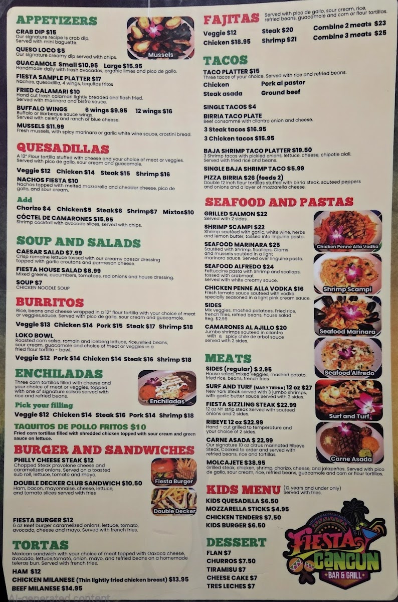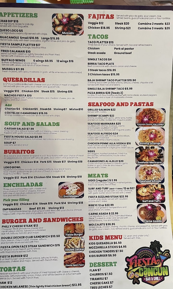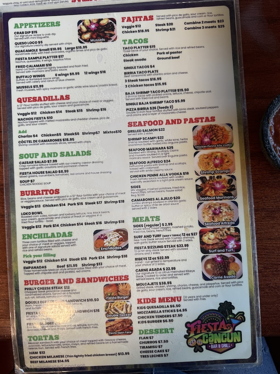 The menu at Fiesta Cancún Bar & Grill features a variety of Mexican dishes alongside some seafood and grill options. It is organized into several groups to cater to diverse tastes and dining preferences.