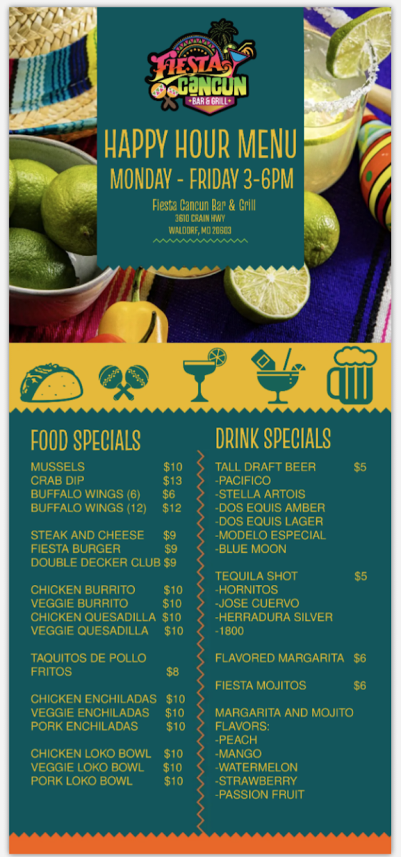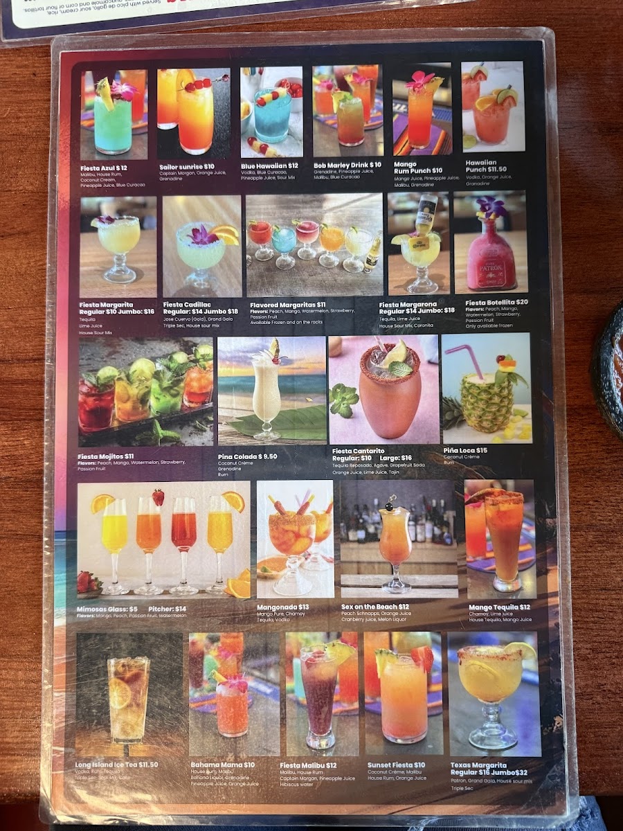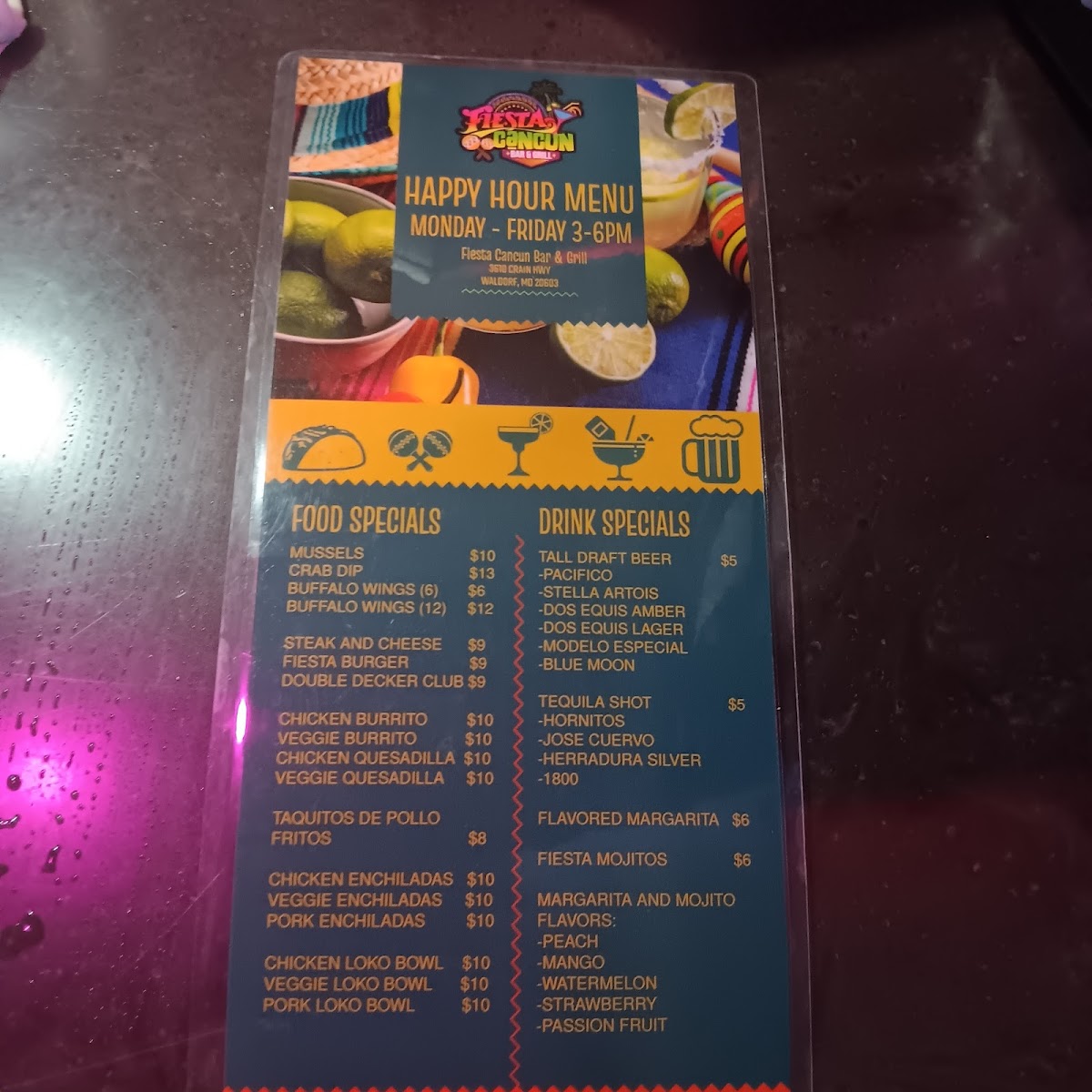 The menu at Fiesta Cancún Bar & Grill features a variety of Mexican dishes alongside some seafood and grill options. It is organized into several groups to cater to diverse tastes and dining preferences.